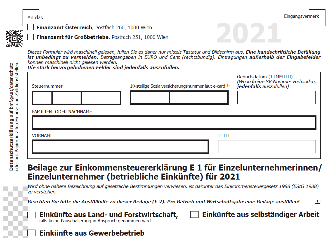 Das Formular E 1a („Beilage zur Einkommensteuererklärung E 1 für Einzelunternehmerinnen/Einzelunternehmer (betriebliche Einkünfte) für 20JJ“) enthält verschiedenste Kennzahlen, in denen jeweils eine spezielle Art von Einnahmen bzw. Ausgaben ausgewiesen werden muss.