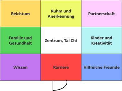 Hier siehst du die Raumaufteilung nach der Feng Shui-Lehre, dessen Ausgangspunkt jeweils die Eingangstüre ist, grafisch dargestellt: